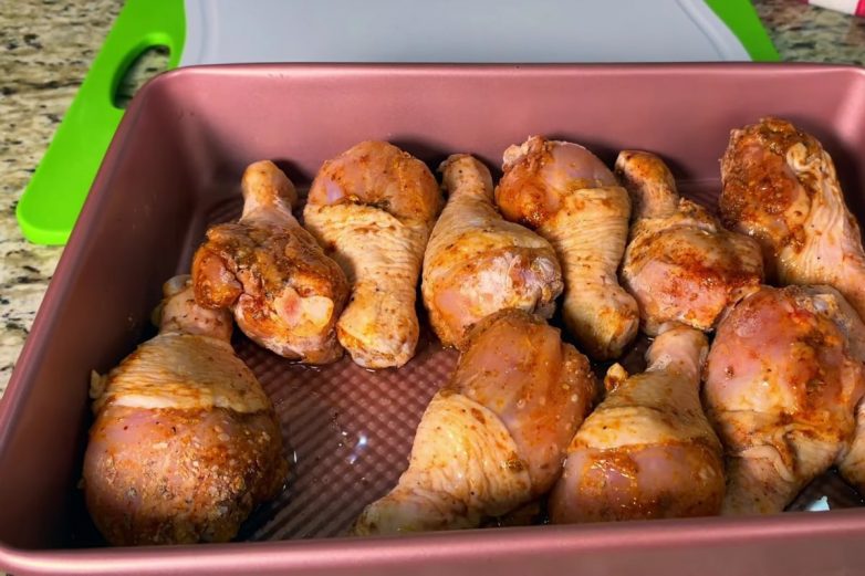 Затем подготовленные куриные ножки хорошенько обмакиваем со всех сторон в разогретом растительном масле и выкладываем их на противень в один слой.После этого отправляем мясо запекаться в разогретую до 200 градусов духовку и запекаем в течение получаса.
