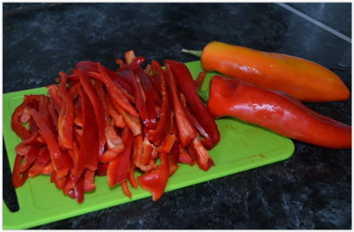Перец необходимо нарезать соломкой. Перец тоже необходимо немного обжарить на растительном масле. Я жарила в два этапа, поэтому масла израсходовала пока жарила перец 200 миллилитров.