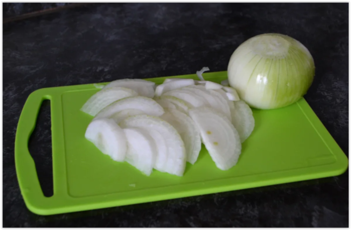 Итак, лук необходимо нарезать полукольцами. Отправить обжариваться на растительном масле (100 миллилитров) до золотистого цвета.