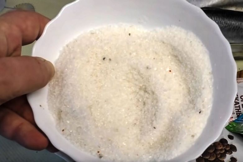 Теперь возьми все сухие ингредиенты, 10 г сахара и 50 г соли. Смешай их в ступке и немного измельчи. Не нужно слишком усердствовать, только слегка пройтись пестиком. Важно раскрыть аромат специй, чтобы селедочка полностью его впитала. Это всего несколько секунд работы, если пользуешься обыкновенным блендером.