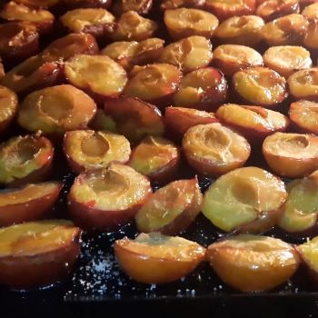 Сливу помыла и обсушила. Нарезала на половинки и выложина на лист. Посолила и посахарила (2 ч.л. соли + 2 ч.л. сахара).