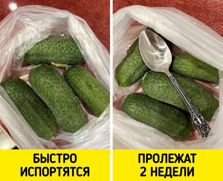 Сохранить огурцы в холодильнике поможет обычная ложка. Положите ее в пакет к огурцам, и они будут оставаться свежими до 2 недель