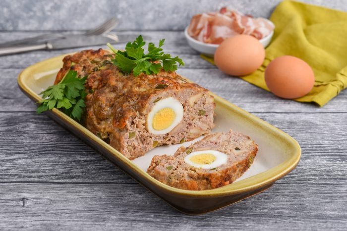 Мясной рулет с яйцами и корнишонами получается пикантным, но при этом сочным. Мякоть пропитывается пряным ароматом, приобретая яркие вкусовые нотки.