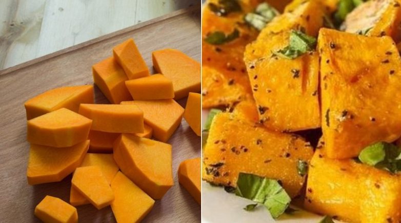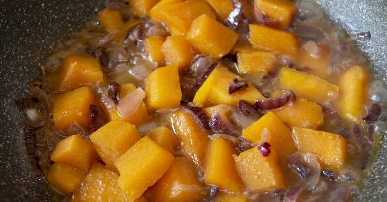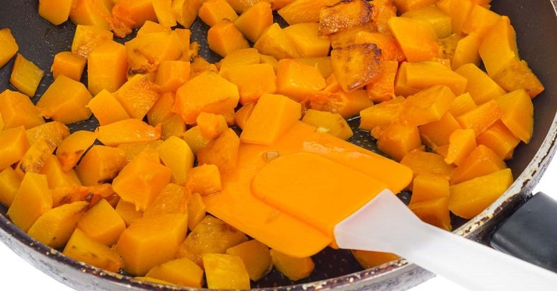 В сковороде с растительным маслом обжаривай тыкву до румяности со всех сторон минут 5–7, помешивая.