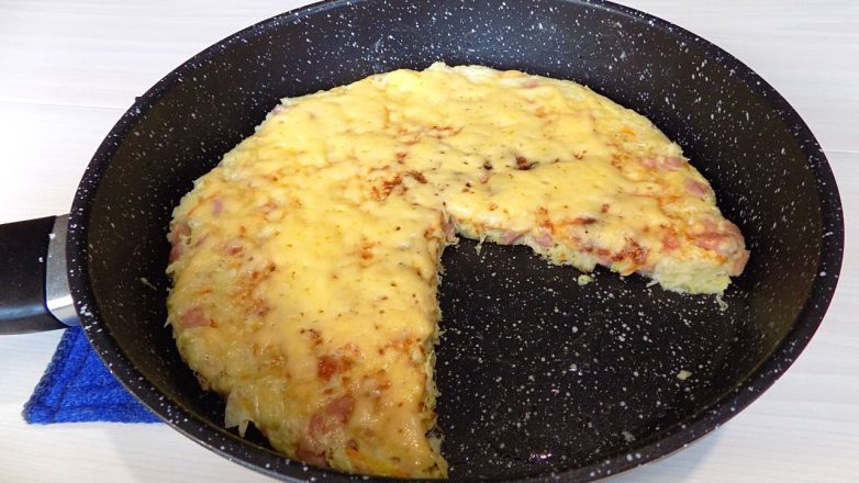9. Переворачиваю запеканку с помощью тарелки и возвращаю ее обратно в сковороду. Посыпаю ее натертым на крупной терке сыром и готовлю еще примерно 7 минут также под закрытой крышкой.