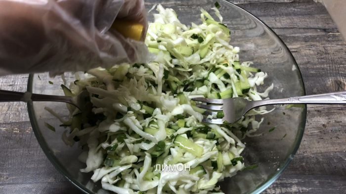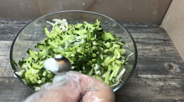 Нарежем огурцы и капусту, как показано на видео и переместим все в миску. И Добавим туда нарезанную кинзу и лук