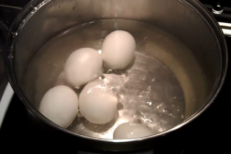 Свари вкрутую яйца. Пока варятся яйца, можно нарезать другие ингредиенты.