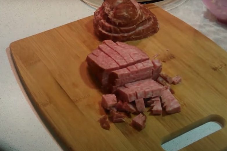 Охлади вареные яйца, очисти и нарежь кубиками.