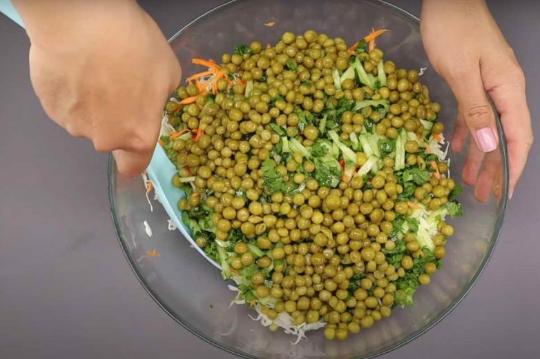 Смешай в миске капусту, морковь, измельченную зелень, огурцы соломкой и консервированный горошек.