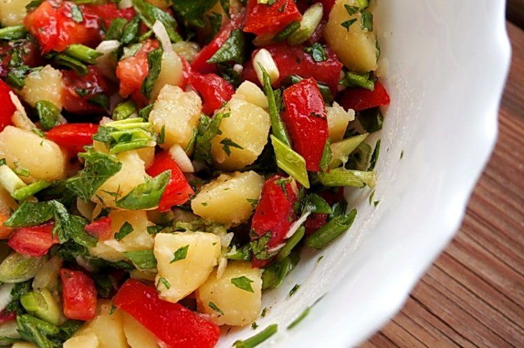 Тебе понадобится: 500 г вареного картофеля, 300 г помидоров, 3 огурца, 1 болгарский перец, 1 луковица, зелень, 30 мл растительного масла, 1 ст.л. винного уксуса, молотый черный перец, хмели-сунели, соль.