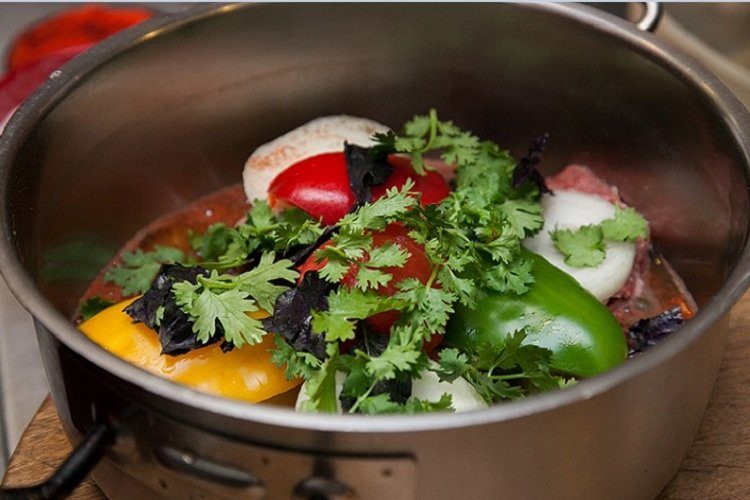 Для приготовления этой хашламы нужна толстостенная посуда с тяжелой крышкой.