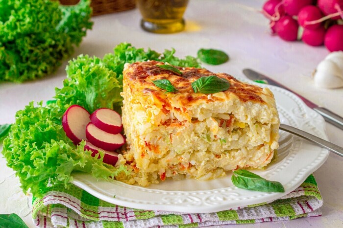Приготовить из риса можно простейшую запеканку на основе ингредиентов, которые можно найти на каждой кухне. А главная его изюминка – нежный, кисломолочный соус.