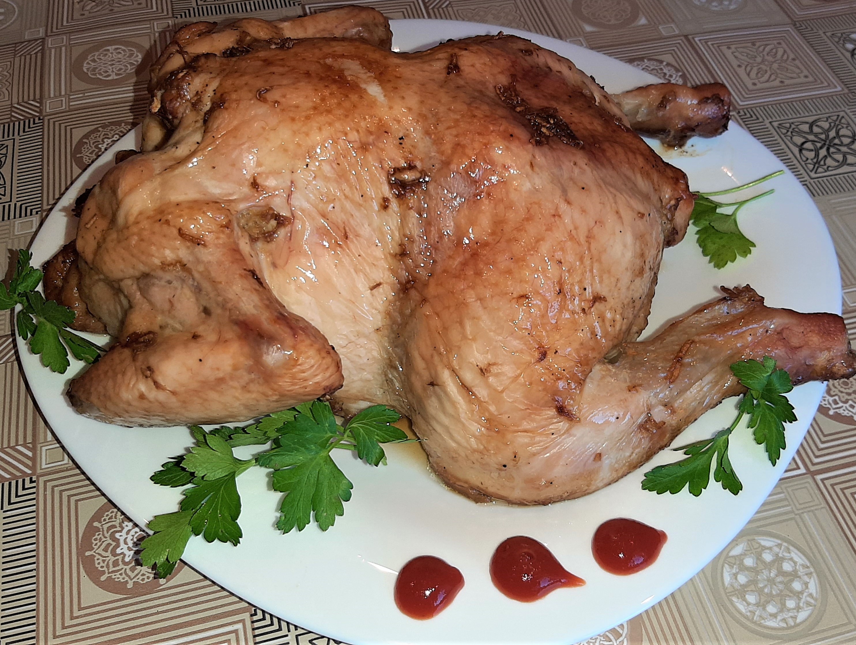 Курицу моем, обсматриваем, удаляем перья и пеньки и хорошо натираем маринадом со всех сторон. Маринуем птицу 2 часа. Духовку разогреваем до 180 градусов и запекаем курицу 1 час 20 минут.