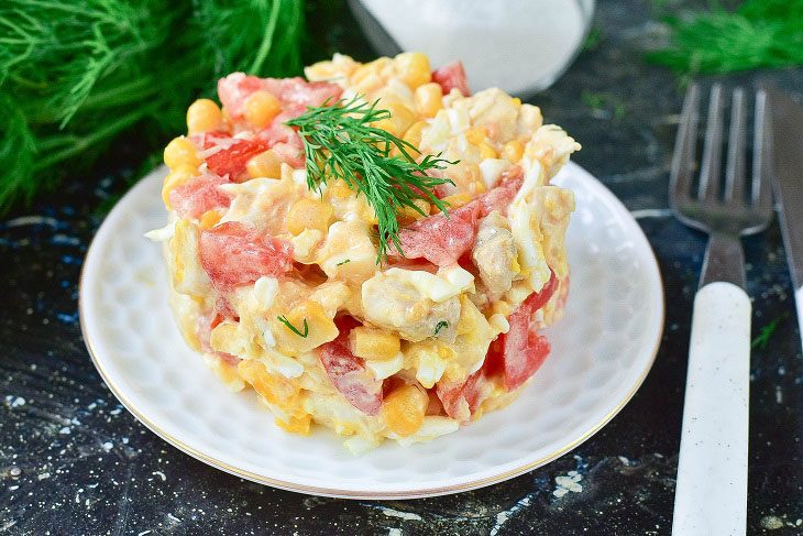 Все нарезанные и подготовленные продукты выложите в большую миску. Это касается и кукурузы и твердого сыра. По вкусу добавьте соль и майонез. Перемешайте салат самой обычной ложкой.