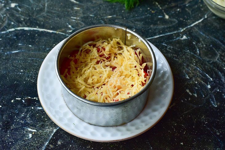 Теперь натрите твердый сыр на мелкой терке. Сначала предполагалось все слои выкладывать в кольцо, но потом этот момент был заменен на несколько другую подачу, о которой речь пойдет ниже.