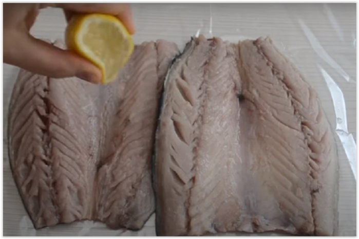 Рыбу очищаем, разделываем ее на филе без костей, поливаем филе соком лимона, присыпаем солью и молотым перцем. При желании можно добавить немного прованских трав или просто использовать «адыгейскую» соль вместо обычной.