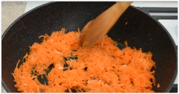 Морковь натираем на терке, обжариваем на сковороде с добавлением масла (лучше сливочного). При желании можно добавить в морковь в процессе обжаривания измельченную маленькую луковицу. В готовую морковь добавляем чеснок, пропустив его через пресс. Сюда же добавляем и желатин (в сухом виде).