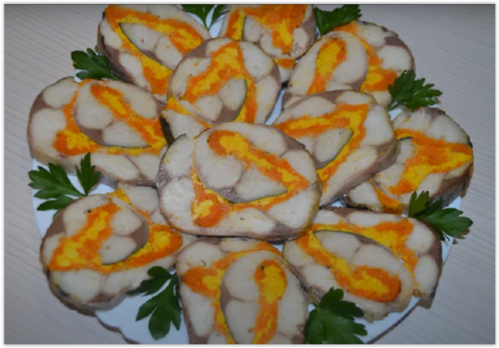 Нам потребуется: самая обычная свежая скумбрия – 2 крупные рыбины. Можно взять замороженную, но здесь необходимо правильно выбрать рыбу, чтобы при разморозке не получить бесформенную массу. Также возьмем одну крупную морковь, желтки от 4-х яиц, 3 зубка свежего чеснока, немного лимонного сока, 15 грамм желатина, а также соль и молотый перец. Для украшения закуски можно взять любую зелень.