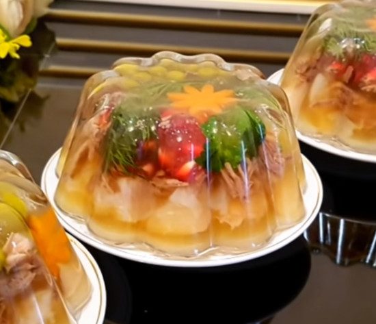 Аккуратно залей декор порцией говяжьего бульона, затем выложи слой мяса, снова заливай бульон, опять выкладывай слой мяса. Оставь холодец в холодном помещении и дождись полного застывания блюда. Как только это произойдет, можно осторожно перевернуть тарелку и получить красивый и аппетитный студень.