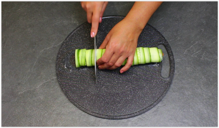 Нарезаю огурец на тонкие полосы, используя обычную овощечистку или специальную терку.
