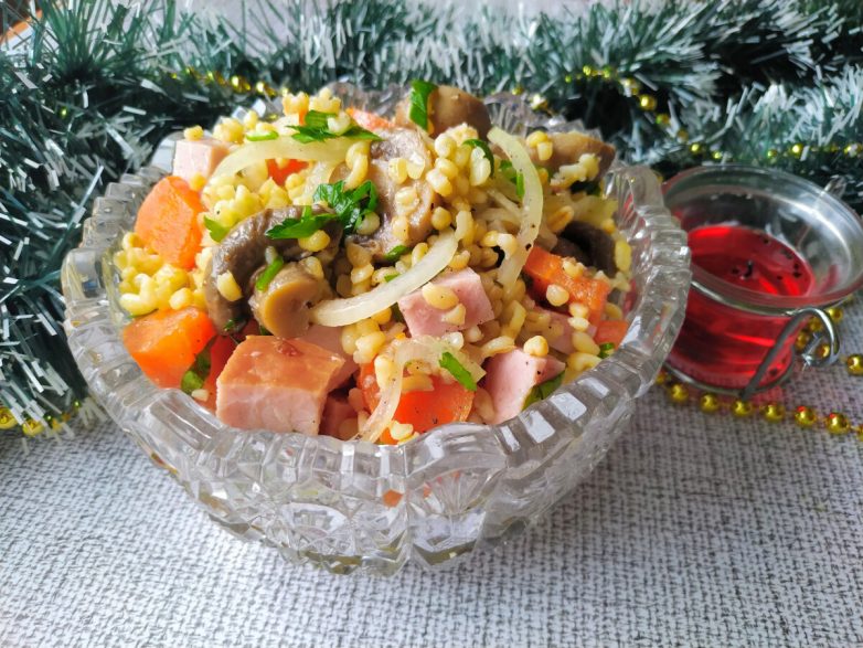 Предварительно нужно отварить булгур в подсоленной воде до готовности, промыть и заправить 2 ст. ложками оливкового масла. Дать полностью остыть.