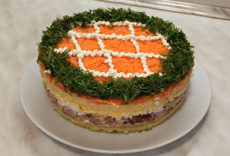 украшаем по своему желанию, я сделала майонезную сеточку и по краям посыпала укропом.