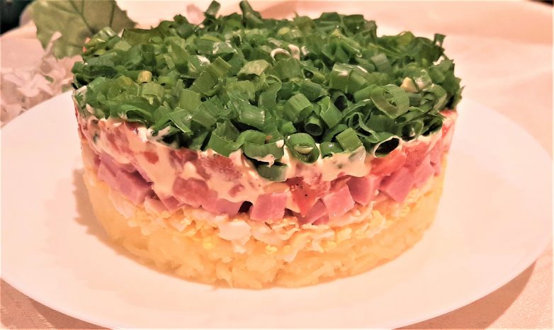 Порежем мелко зеленый лук и нанесем последним слоем – салат можно подавать к столу! Вкусный, яркий слоеный салат с ветчиной и помидорами готов! Более подробный рецепт приготовления смотрите на видео!