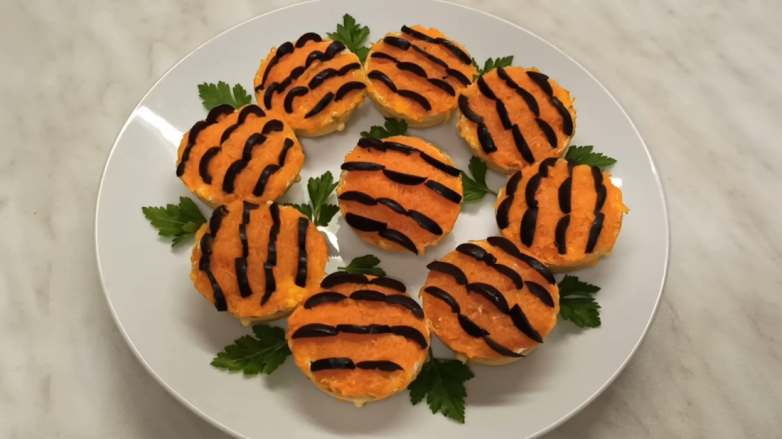 3.Наполняем тарталетки начинкой, равняем верх ложкой.Сверху выкладываем морковь, равняем по всей поверхности.Далее выкладываем полосками маслины.Украшаем зеленью и подаем к столу.