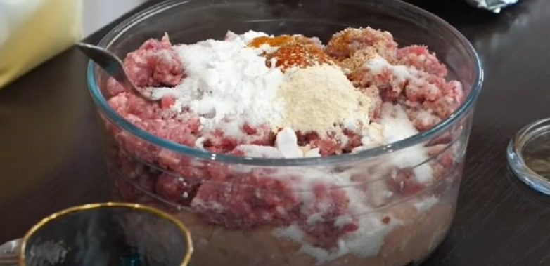 Всыпь сухой чеснок и мускатный орех. Долей к фаршу воду. Руками хорошенько вымешай фарш. Мясо можно накрыть пищевой пленкой и поставить в холодильник на ночь, а можно и сразу готовить.