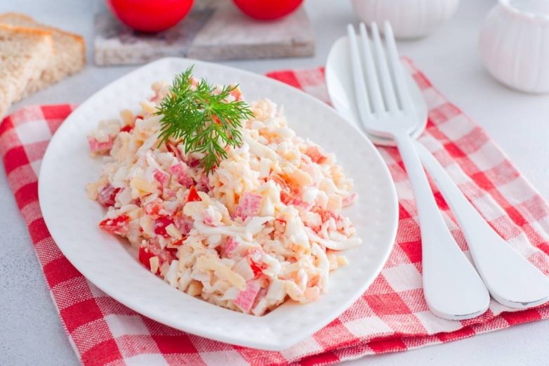 Осталось только смешать получившиеся кусочки крабовых палочек, помидоров и твердого сыра в одной емкости с майонезом (либо соусом для заправки). Не забудь немного посолить по вкусу. Готово, можно подавать к столу!