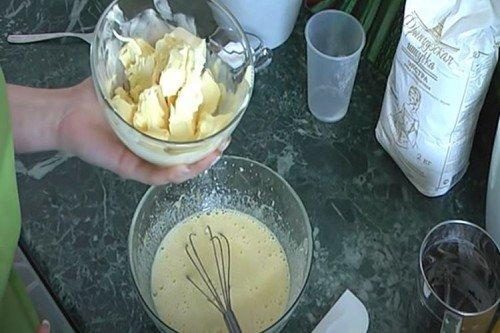 2. Размягченное (но не растаявшее) сливочное масло нарежь кубиками и добавь к яйцам. Размешай венчиком или вилкой.