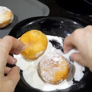 Сразу горячие пончики обваливаем в сахаре или сахарной пудре крупного помола. При желании к сахару можно добавить 1 ч.л. корицы.