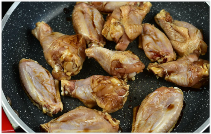 Разогреть сковороду и обжарить крылышки на среднем огне в течение 4 минут с каждой стороны.