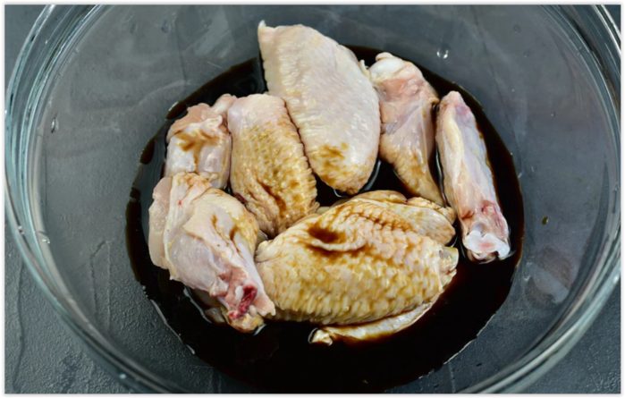 Нужно смешать крылышки с соевым соусом в отдельной миске.
