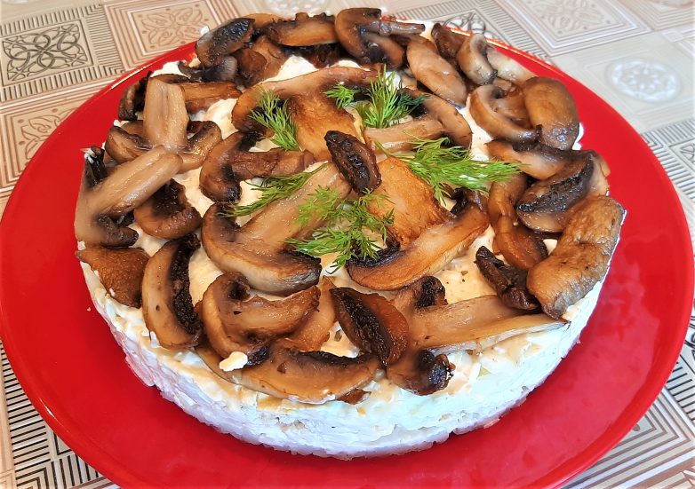 Четвертым слоем выкладываем обжаренные грибы и отправляем салат в холодильник на 20 минут настояться и пропитаться.