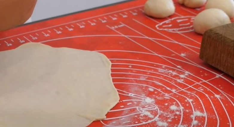 Тесто не должно липнуть к рукам. Скатай из теста колбаску и нарежь его на кусочки. Выходит около 7 кусочков. Каждый кусочек теста собери в комок, а затем тонко раскатай.