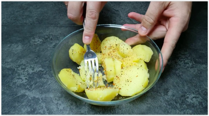 Картофель отвариваем, охлаждаем. Добавляем соль, чёрный перец, перец чили, сушёный чеснок и разминаем вилкой.