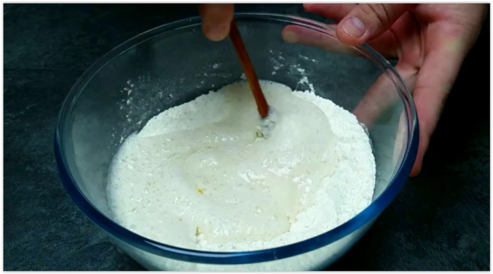 Накрываем тонким полотенцем или пищевой плёнкой и ставим в тёплое место на 30 минут для подъёма теста.