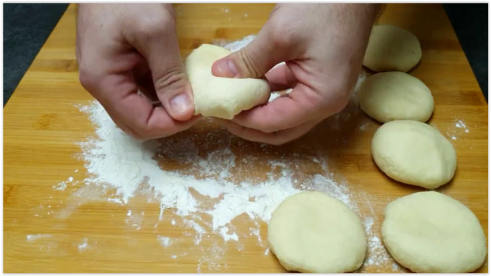 Подошедшее тесто слегка обминаем руками, перекладываем на припылённый мукой стол. Делим на 6-8 частей