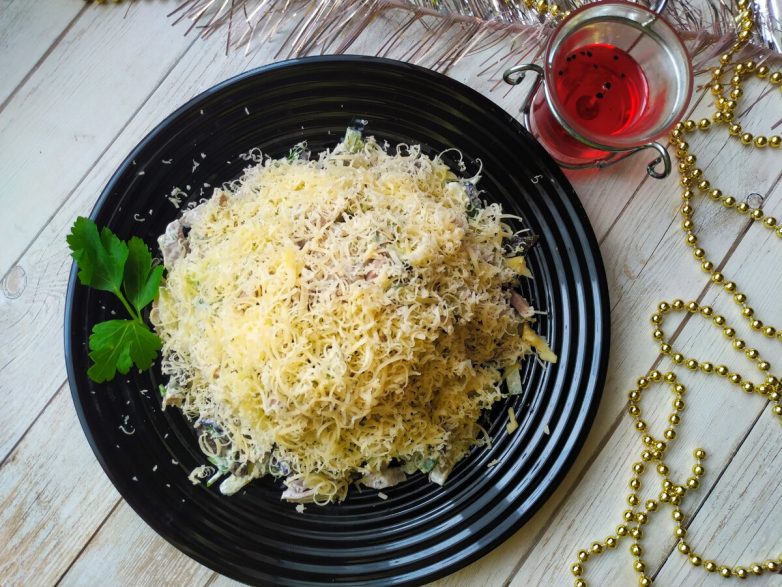 Сверху на салат натереть на мелкой терке сыр.