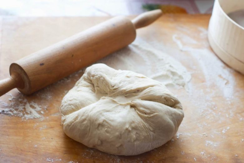 Присыпь тесто мукой сверху и подготовь чистое кухонное полотенце из хлопчатобумажной ткани. Присыпь полотенце мукой хорошенько, а тесто раздели на 3 части.