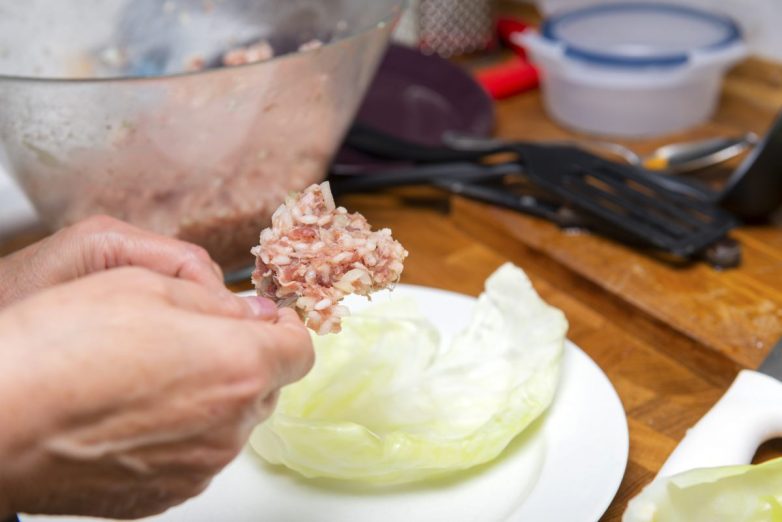 Мелко поруби свинину и говядину или смешай два вида фарша. К мясу добавь 2 ст. л. риса и 1 ст. л. томатной пасты. Посоли и поперчи начинку.
