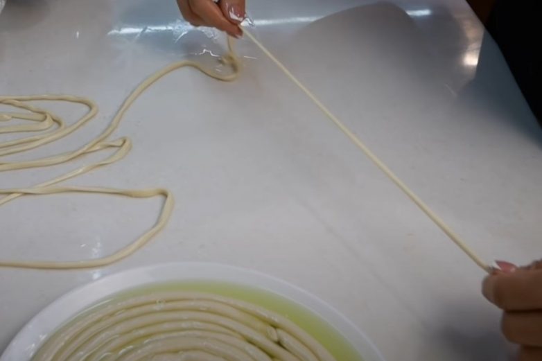 Стараясь не спутать, вытягивай лапшу, начиная с центра спирали. Если ты видишь, что лапша слишком сухая и не тянется, дополнительно смажь ее маслом.
