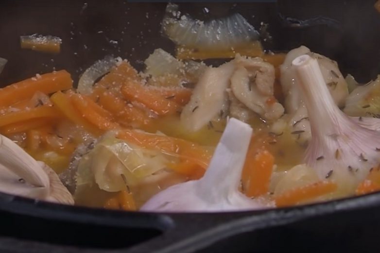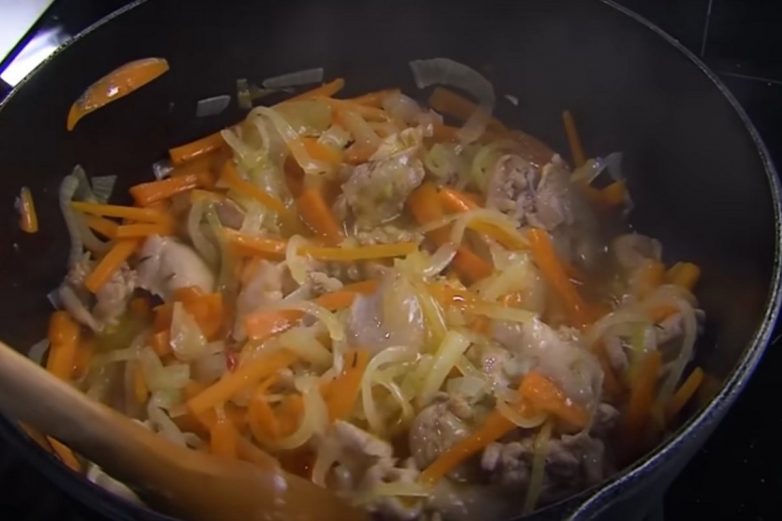 Как только курица зарумянится, отправь к ней лук и морковь.