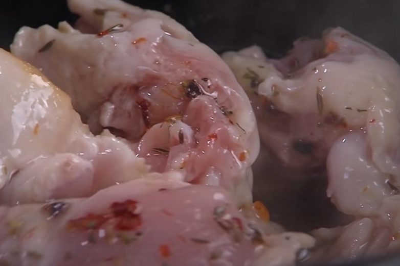 Выложи в нее курицу. Добавь свои любимые пряности для плова, посоли.