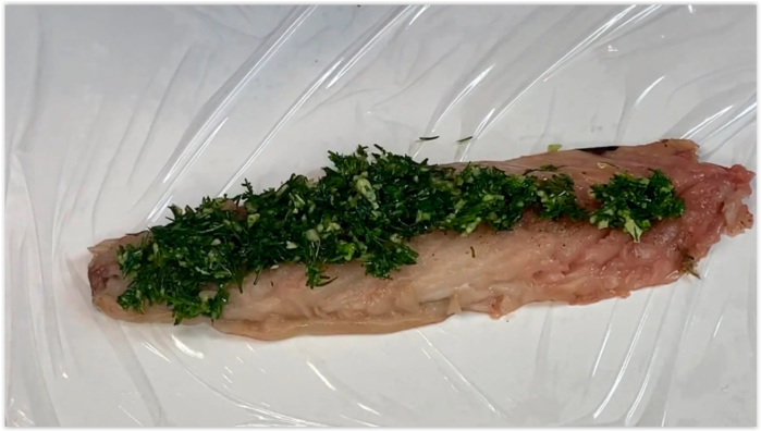 Сверху на укроп мы выкладываем второе филе. Начинаем скручивать пищевую пленку.