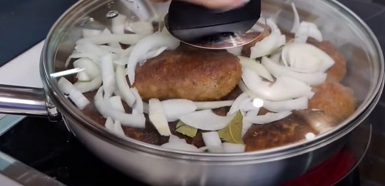 Перекладывай обжаренные котлеты в кастрюлю. Сверху выложи на них порезанный кольцами лук, 1 лавровый лист и горсть черного душистого перца горошком. Залей котлеты водой и слегка присоли.