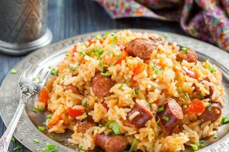 Тебе понадобится: 400 г копченых сосисок, 350 г риса или булгура, 1 луковица, 200 г болгарского перца, 300 г помидоров, 2 зубчика чеснока, 60 мл растительного масла, 1 ст.л. томатной пасты, пучок зелени, специи.