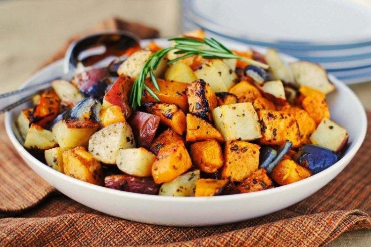 Приготовление: Нарежь морковь и картофель брусочками, лук – полукольцами, а помидор натри на терке. Сложи все в миску, добавь специи, и туда же влей около 1 ст.л. масла. Выложи овощи в рукав и запекай около полутора часов при 180 градусах. Перед подачей посыпь зеленью и давленым чесноком.