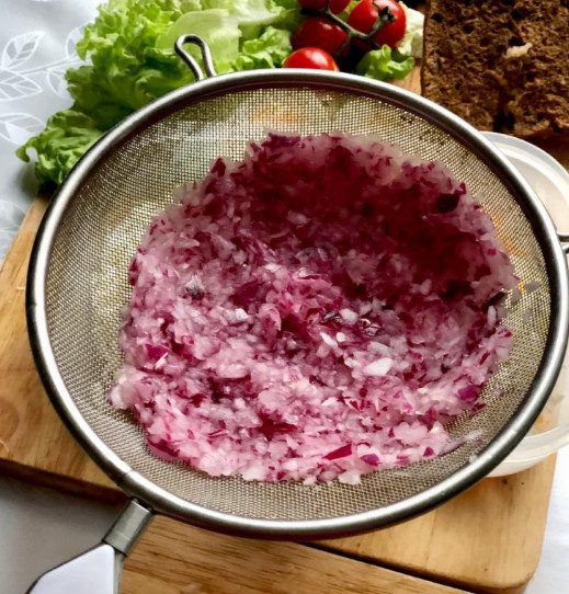 Когда лук замариновался, его хорошо отжимаем от лишней влаги и отправляем в общую массу.